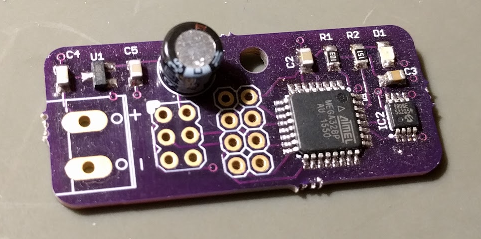 The MCP9808 uses I2C for communication and I2C requires pull-up resistors in order to work correctly. However, I really didn’t want to include external pull-up resistors on this board because a) that means more parts to place and b) the smaller the pull-up resistors are, the more current flows during I2C communication and we want to drive our current needs as low as possible. I ended up just relying on the internal 20KΩ pull-ups in the ATMega328P and hoped that would be sufficient given the expected low capacitance of the data lines. (Spoiler alert: it was, just barely. More on that later.)