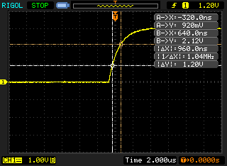 I mentioned earlier that I left out the usual external pull-up resistors on the I2C data lines, hoping that the ATMega328P internal pull-ups would be sufficient. After I assembled and programmed a sensor board I double-checked the bus timing with my oscilloscope and it turned out that I bet correctly, just barely. The I2C spec says that for a standard rate data bus (100 kbit/s), the maximum rise time must be 1µs or less, where rise time is defined as the time it takes to go from 0.3VDD to 0.7VDD. In our case VDD is 3V, so we’re looking for the time it takes for the rising edge to go from just under 1V to just over 2V. It turns out that we’re squeaking in just under the limit: